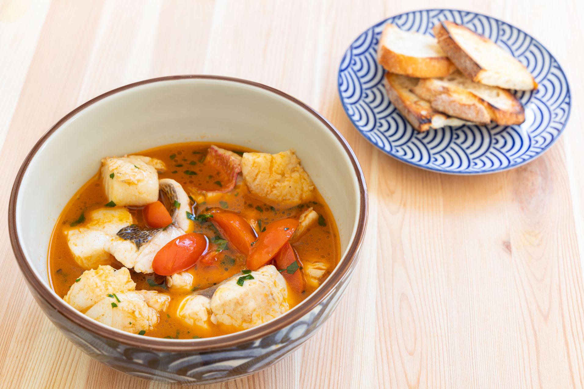 Il brodo è insaporito dal classico tris di verdure all'italiana, pomodori pelati e uno spicchio d'aglio. I pomodorini sono aggiunti solo alla fine, per assaporarne al massimo la dolcezza naturale e anche per aggiungere una nota acida del piatto. E non sarebbe una zuppa di pesce senza un buon crostone di pane abbrustolito sfregato con l'aglio, e, ovviamente, un po' di prezzemolo alla fine.